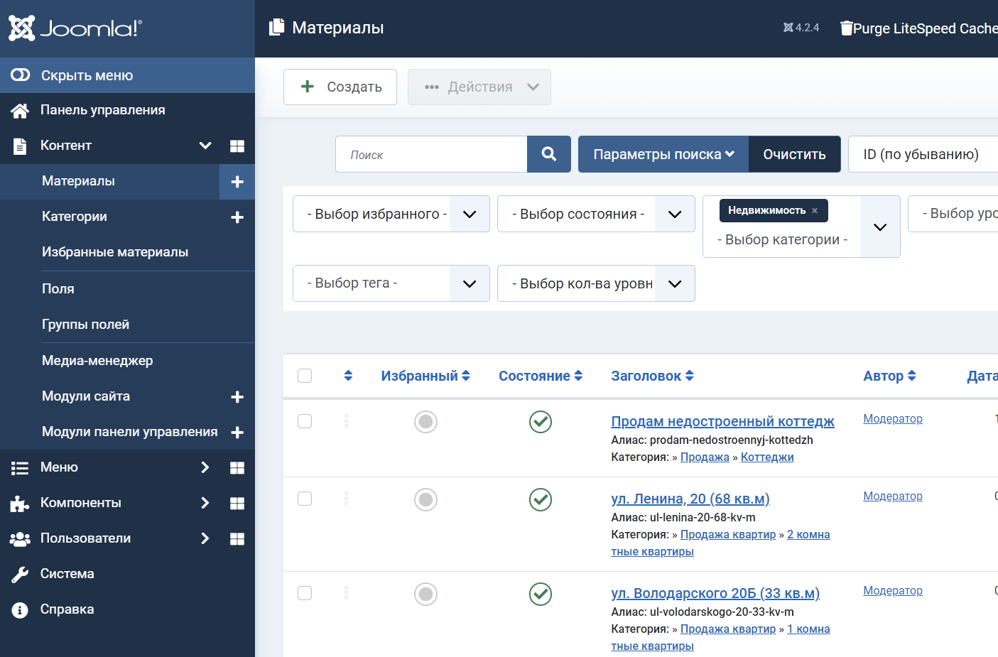 Каталог недвижимости в портале "мой Город", как и все остальные разделы каталогов, реализован на стандартных возможностях системы управления CMS Joomla, без использования сторонних компонентов и расширений.
